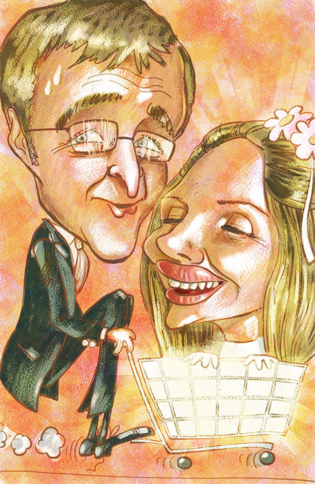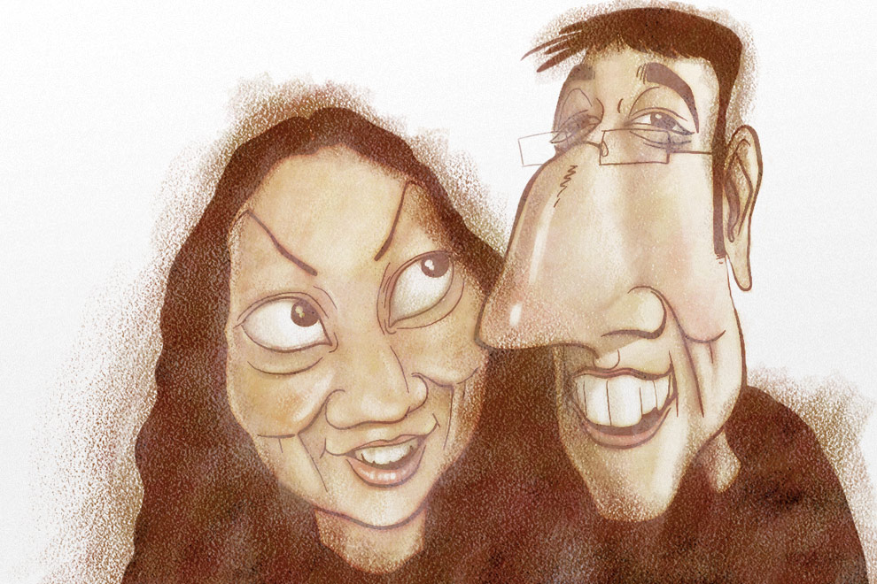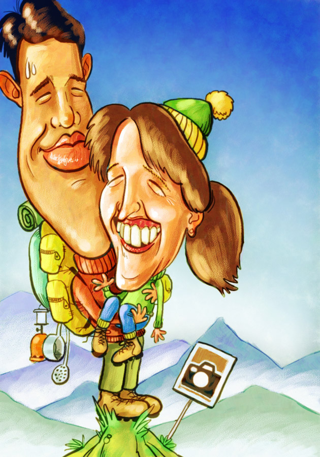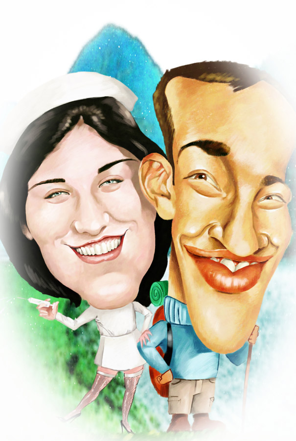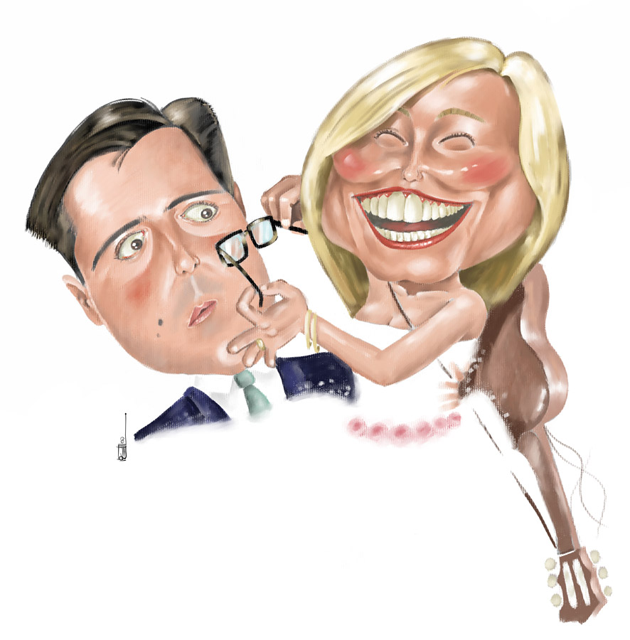 De tant en tant rebia encàrrecs de parelles que es casaven per a fer-los una caricatura. No eren treballs continus, sinó dibuixos que sorgien de manera puntual, cada un amb la seua pròpia història. Per a cada il·lustració, els nuvis em passaven fotos seues juntament amb indicacions sobre els seus treballs, entreteniments o aficions, de manera que poguera capturar no sols els seus trets físics, sinó també aspectes de la seua personalitat. La idea era crear un record gràfic amb humor i carinyo, una xicoteta picada d’ullet divertida que reflectira la seua complicitat.