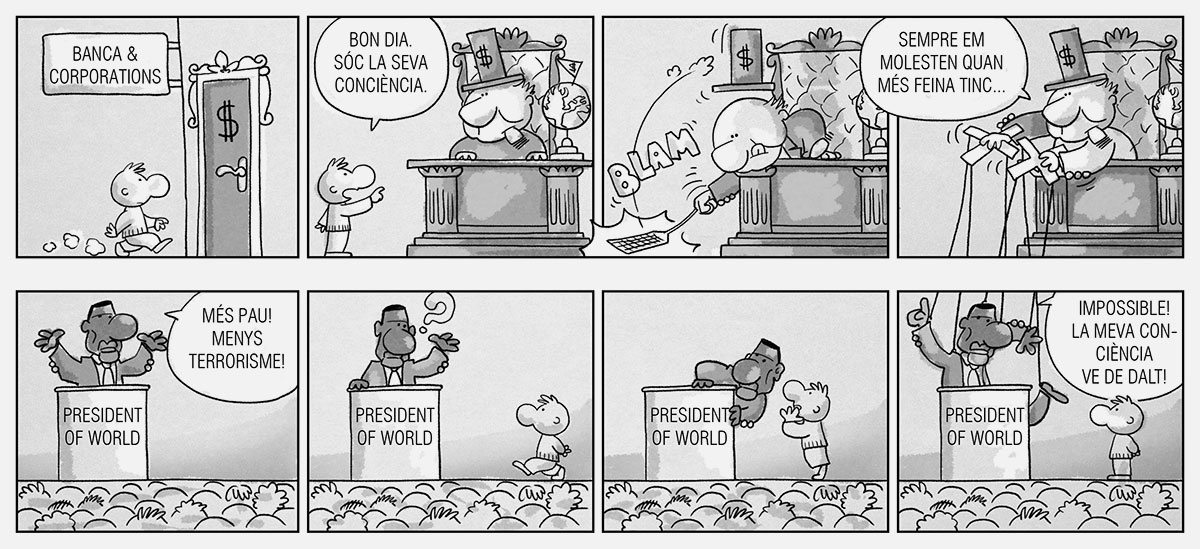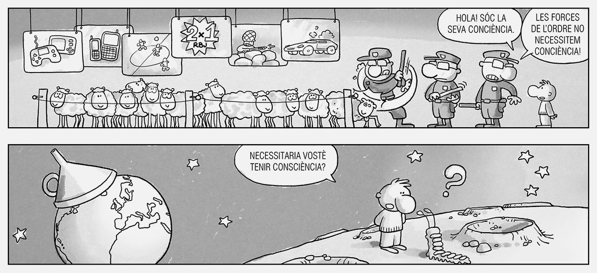 Menuda conciència és un conjunt de tires còmiques realitzades per a la primera edició del Premi Internacional de Cómic Ciudad de Badalona-Caixa Laietana de Tires de Còmic, en el qual este treball va quedar finaliste. Per a participar era necessari presentar deu tires en blanc i negre amb un nexe comú; cada una podia ser autoconclusiva o formar part d’una història serialitzada. En este cas, les tires funcionen de manera independent i el fil conductor és un personatge que encarna la consciència d’autoritats i dirigents de discurs hipòcrita i moral simulada de la societat.