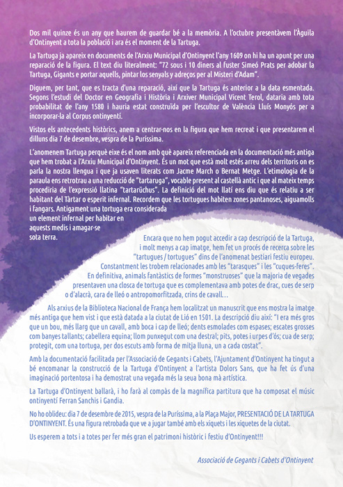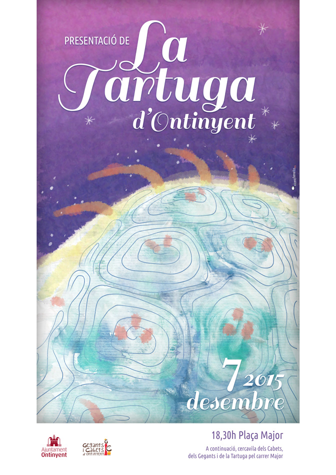 Este encàrrec va resultar especialment desafiador, ja que em van sol·licitar dissenyar un cartell per a la presentació de la nova figura de l’Associació de Gegants i Cabets d’Ontinyent, denominada La Tartuga, però sense mostrar-la directament. Aprofitant la silueta i les formes de la figura, vaig decidir crear un univers fantàstic que evocara la màgia i la imaginació d’un conte il·lustrat. D’esta manera, el cartell transmet una sensació de misteri i aventura, convidant a descobrir l’inesperat, i al mateix temps està pensat per a atraure especialment als més menuts, als qui va dirigida la festa dels Gegants i Cabets.